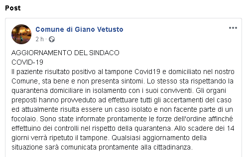 Il paziente risultato positivo al tampone Covid19 e domiciliato nel nostro Comune, sta bene e non presenta sintomi. Lo stesso sta rispettando la quarantena domiciliare in isolamento con i suoi conviventi. Gli organi preposti hanno provveduto ad effettuare tutti gli accertamenti del caso ed attualmente risulta essere un caso isolato e non facente parte di un focolaio. Sono state informate prontamente le forze dell'ordine affinché effettuino dei controlli nel rispetto della quarantena. Allo scadere dei 14 giorni verrà ripetuto il tampone. Qualsiasi aggiornamento della situazione sarà comunicata prontamente alla cittadinanza."