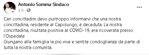 "Cari concittadini devo purtroppo informarvi che una nostra concittadina, residente al Capoluogo, è deceduta. La nostra concittadina, risultata positiva al COVID-19, era ricoverata presso l’Ospedale... Giungano alla famiglia le più vive e sentite condoglianze da parte di tutta la nostra comunità."
