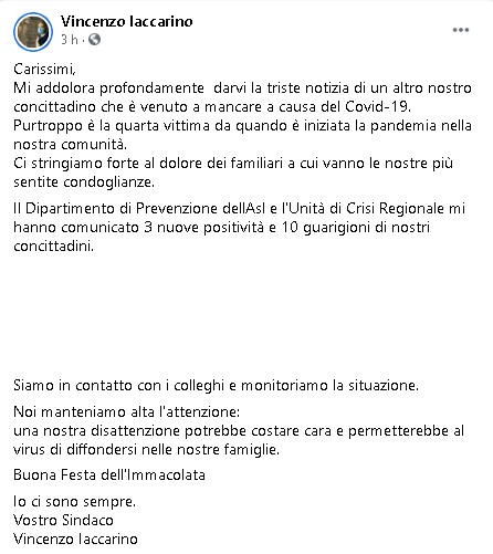 Lo apprendiamo dalla bacheca Facebook di Vincenzo Iaccarino, Sindaco di Piano di Sorrento.