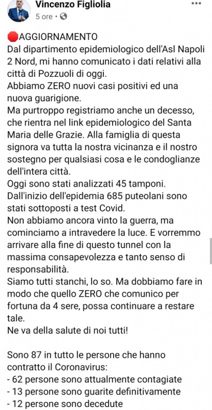Ma purtroppo registriamo anche un decesso, che rientra nel link epidemiologico del Santa Maria delle Grazie. Alla famiglia di questa signora va tutta la nostra vicinanza e il nostro sostegno per qualsiasi cosa e le condoglianze dell'intera città. Oggi sono stati analizzati 45 tamponi. Dall'inizio dell'epidemia 685 puteolani sono stati sottoposti a test Covid. Non abbiamo ancora vinto la guerra, ma cominciamo a intravedere la luce. E vorremmo arrivare alla fine di questo tunnel con la massima consapevolezza e tanto senso di responsabilità. Siamo tutti stanchi, lo so. Ma dobbiamo fare in modo che quello ZERO che comunico per fortuna da 4 sere, possa continuare a restare tale. Ne va della salute di noi tutti! Sono 87 in tutto le persone che hanno contratto il Coronavirus: