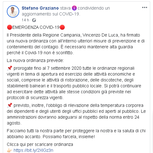 Il Presidente della Regione Campania, Vincenzo De Luca, ha firmato una nuova ordinanza con all’interno ulteriori misure di prevenzione e di contenimento del contagio. È necessario mantenere alta guardia perché il Covid-19 non è sconfitto. La nuova ordinanza prevede: prorogate fino al 7 settembre 2020 tutte le ordinanze regionali vigenti in tema di apertura ed esercizio delle attività economiche e sociali, comprese le attività di ristorazione, delle discoteche, degli stabilimenti balneari e il trasporto pubblico locale. Si potrà continuare ad esercitare dette attività alle stesse condizioni già previste nei protocolli di sicurezza vigenti. previsto, inoltre, l’obbligo di rilevazione della temperatura corporea dei dipendenti e degli utenti degli uffici pubblici ed aperti al pubblico. Le amministrazioni dovranno adeguarsi al rispetto della norma entro 24 agosto. Facciamo tutti la nostra parte per proteggere la nostra e la saluta di chi abbiamo accanto. Possiamo farcela, insieme! Clicca qui per scaricare ordinanza https://bit.ly/2XIGz3n".