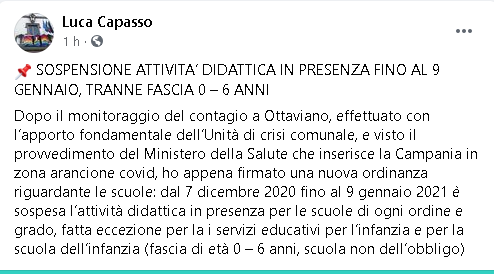 Lo apprendiamo dalla pagina Facebook di Luca Capasso, Sindaco di Ottaviano.