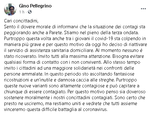 "Cari concittadini, Sento il dovere morale di informarvi che la situazione dei contagi sta peggiorando anche a Parete. Stiamo nel pieno della terza ondata. Purtroppo questa volta anche tra i giovani il covid-19 sta colpendo in maniera più grave e per questo motivo da oggi ho deciso di riattivare il servizio di assistenza sanitaria domiciliare. Al momento nessuno è stato ricoverato. Invito tutti alla massima attenzione. Bisogna evitare qualsiasi forma di contatto con i non conviventi. Allo stesso tempo invito i cittadini ad una maggiore solidarietà nei confronti delle persone ammalate. In questo periodo sto ascoltando fantasiose ricostruzioni e un’inutile e dannosa caccia alle streghe. Purtroppo queste nuove varianti sono altamente contagiose e può capitare a chiunque di essere contagiato. Per questo motivo penso sia doveroso sostenere moralmente i nostri concittadini contagiati. Sono certo che presto ne usciremo, ma restiamo uniti e vedrete che tutti assieme vinceremo questa difficile battaglia al coronavirus."