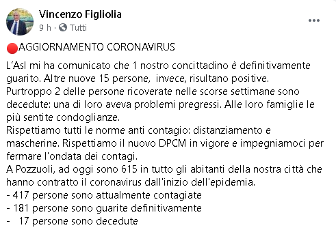 Lo apprendiamo dalla pagina Facebook del Sindaco di Pozzuoli, Vincenzo Figliolia.