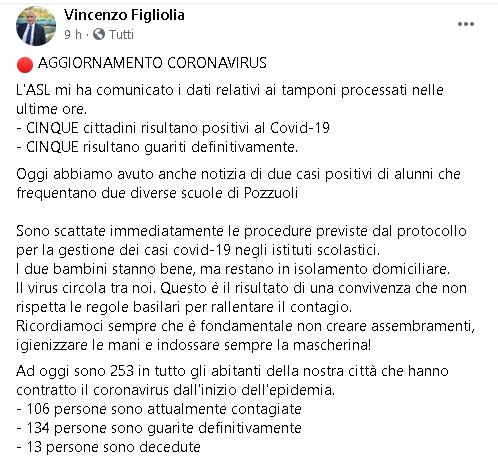 Lo apprendiamo dalla pagina Facebook del Sindaco di Pozzuoli, Vincenzo Figliolia.