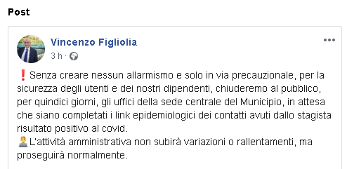 "Senza creare nessun allarmismo e solo in via precauzionale, per la sicurezza degli utenti e dei nostri dipendenti, chiuderemo al pubblico, per quindici giorni, gli uffici della sede centrale del Municipio, in attesa che siano completati i link epidemiologici dei contatti avuti dallo stagista risultato positivo al covid. L’attività amministrativa non subirà variazioni o rallentamenti, ma proseguirà normalmente."