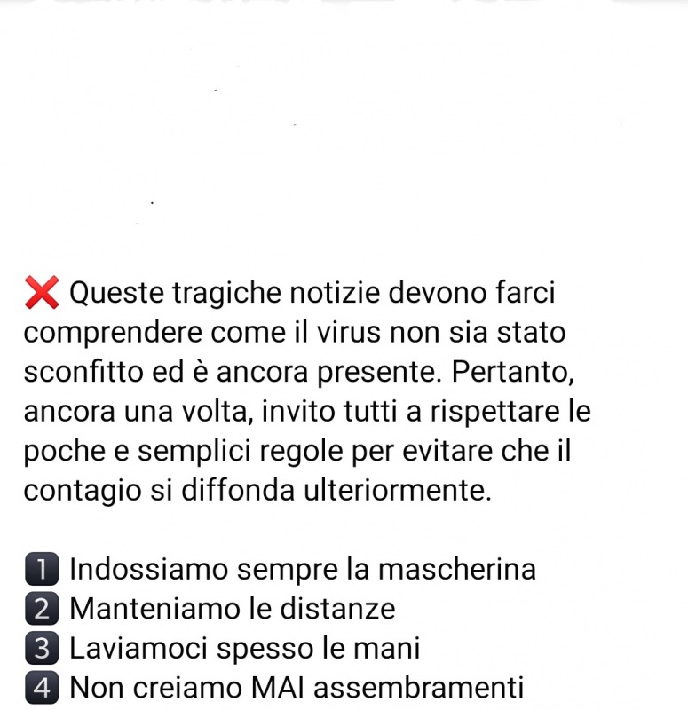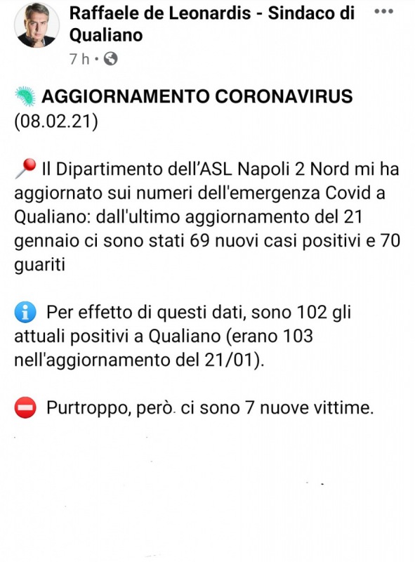 "Il Dipartimento dell’ASL Napoli 2 Nord mi ha aggiornato sui numeri dell'emergenza Covid a Qualiano: dall'ultimo aggiornamento del 21 gennaio ci sono stati 69 nuovi casi positivi e 70 guariti. Per effetto di questi dati, sono 102 gli attuali positivi a Qualiano (erano 103 nell'aggiornamento del 21/01). Purtroppo, però, ci sono 7 nuove vittime...Queste tragiche notizie devono farci comprendere come il virus non sia stato sconfitto ed è ancora presente. Pertanto, ancora una volta, invito tutti a rispettare le poche e semplici regole per evitare che il contagio si diffonda ulteriormente."