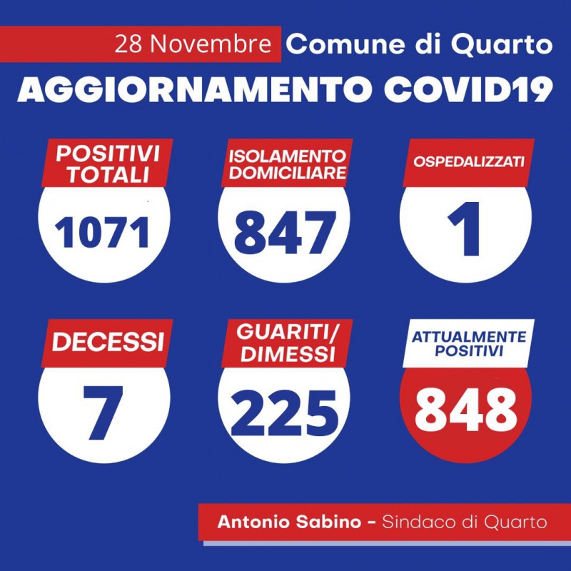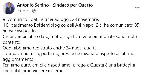 Lo apprendiamo dalla pagina Facebook di Antonio Sabino, Sindaco di Quarto.