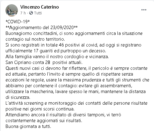 Lo apprendiamo dalla bacheca Facebook del Sindaco di San Cipriano d'Aversa, Vincenzo Caterino.