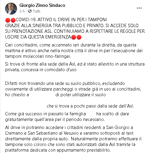 Lo apprendiamo dalla pagina facebook di Giorgio Zinno, Sindaco di San Giorgio a Cremano.