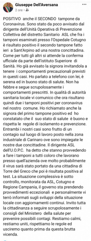 "POSITIVO anche il SECONDO tampone da Coronavirus. Sono stato da poco avvisato dal dirigente dell'Unità Operativa di Prevenzione Collettiva del distretto Sanitario ASL che fra i tamponi esaminati presso l'Ospedale Cotugno è risultato positivo il secondo tampone fatto ieri a Sant'Arpino ad una nostra concittadina. Come per tutti gli altri si attende la conferma ufficiale da parte dell'istituto Superiore di Sanità. Ho già avvisato la signora invitandola a tenere 1i comportamenti precauzionali previsti in questi casi. Ho parlato a telefono con lei, è serena ed in buono stato di salute. Non ha febbre e segue scrupolosamente i comportamenti prescritti. In qualità di autorità sanitaria locale vi comunico che ora risultano quindi due i tamponi positivi per coronavirus nel nostro comune. Ho richiamato anche la signora del primo tampone positivo ed ho constatato che il suo stato di salute è buono e rispetta le regole di isolamento e prevenzione. Entrambi i nostri casi sono frutto di un contagio sul luogo di lavoro posto nella zona industriale di Carinaro ove sono impiegate le nostre due concittadine. Il dirigente ASL dell'U.O.P.C. ha detto che stanno provvedendo a fare i tamponi a tutti coloro che lavorano presso quell'azienda ove molto probabilmente il virus sarà stato portato da una cittadina di Torre del Greco che poi è risultata positiva al test. La situazione complessiva è sotto controllo, monitorata da ASL, Cotugno e Regione Campania, il governo sta prendendo provvedimenti eccezionali e personalmente vi terrò informati sugli sviluppi della situazione locale con aggiornamenti continui. Invito tutta la cittadinanza a seguire scrupolosamente i consigli del Ministero della salute per prevenire possibili contagi. Restiamo calmi, restiamo uniti, rispettiamo le regole ed usciremo quanto prima da questa brutta vicenda."