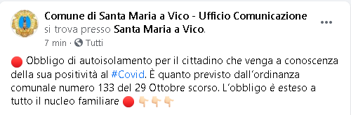 Lo apprendiamo dalla pagina Facebook Comune di Santa Maria a Vico - Ufficio Comunicazione.