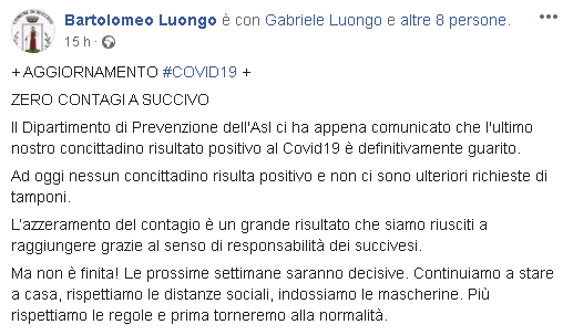 "AGGIORNAMENTO COVID19. ZERO CONTAGI A SUCCIVO. Il Dipartimento di Prevenzione dell'Asl ci ha appena comunicato che l'ultimo nostro concittadino risultato positivo al Covid19 è definitivamente guarito. Ad oggi nessun concittadino risulta positivo e non ci sono ulteriori richieste di tamponi. L’azzeramento del contagio è un grande risultato che siamo riusciti a raggiungere grazie al senso di responsabilità dei succivesi. Ma non è finita! Le prossime settimane saranno decisive. Continuiamo a stare a casa, rispettiamo le distanze sociali, indossiamo le mascherine. Più rispettiamo le regole e prima torneremo alla normalità."