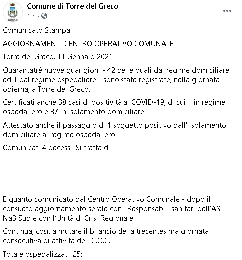 Lo apprendiamo dalla pagina Facebook del Comune di Torre del Greco.
