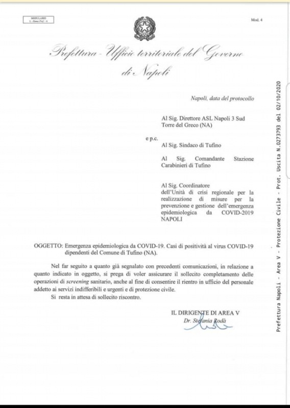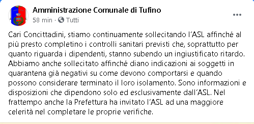 COVID19, TUFINO. Casi positivi dipendenti comunali. Screening sanitario ASL. La nota del Comune