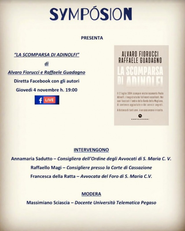 "Sarà presentato il prossimo 4 novembre alle 19 in webinar durante l’evento inaugurale della piattaforma Sympòsion il libro inchiesta edito da Castelvecchi (Roma) di Alvaro Fiorucci, perugino caporedattore Tg3 Umbria, e Raffaele Guadagno, scrittore casertano, sulla scomparsa del giudice Paolo Adinolfi, magistrato campano in forza alla sezione fallimentare del Tribunale di Roma, avvenuta misteriosamente il 2 luglio 1994: -si legge nlla nota- da tal data della sorte del magistrato che durante la sua permanenza presso detta sezione aveva incrociato personaggi legati ai più oscuri misteri italiani, non se ne è più avuta notizia. Il volume edito da Castelvecchi di Roma, ripercorre la storia di tali eventi attraverso le cronache dell’epoca e percorrendo teorie sul mistero che aleggia intorno il destino dell’integerrimo giudice. All’evento che sarà moderato da Massimiano Sciascia, avvocato e docente universitario di diritto amministrativo, ideatore del Sympòsion – centro culturale on line -, parteciperanno le cofondatrici Annamaria Sadutto, -si legge nlla nota- consigliere dell’ordine degli avvocati di Santa Maria Capua Vetere, Francesca Della Ratta, avvocata impegnata nella tutela delle pari opportunità, e vi sarà la presenza del magistrato antimafia attualmente consigliere della Suprema Corte di Cassazione Raffaello Magi. Per partecipare all’evento: https://fb.me/e/3RlDfSF6J Per info sulla pagina Sympòsion: https://www.facebook.com/symposioncaserta"