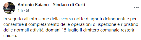 Questo il post pubblicato dal Sindaco di Curti Antonio Raiano sulla sua pagina Facebook: "In seguito all’intrusione della scorsa notte di ignoti delinquenti - si legge nel post - e per consentire il completamento delle operazioni di ispezione e ripristino delle normali attività, domani 15 luglio il cimitero comunale resterà chiuso".