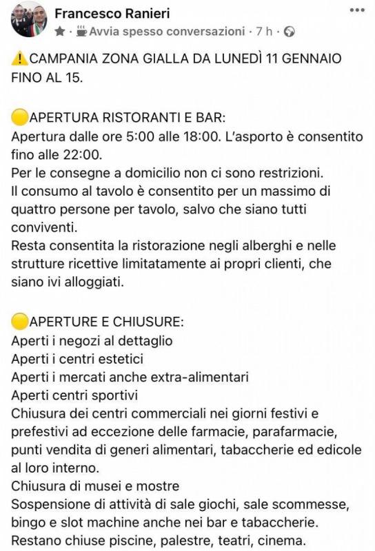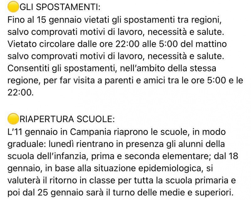 Da oggi fino al 15/1 Campania in ZONA GIALLA. Tutto su apertura e chiusura ristoranti, bar, negozi, spostamenti e scuola