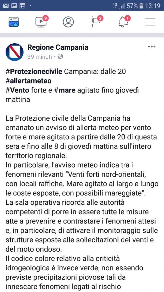 Questo il testo del post fb dalla pagina Regione Campania: "La Protezione civile della Campania ha emanato un avviso di allerta meteo per vento forte e mare agitato a partire dalle 20 di questa sera e fino alle 8 di giovedì mattina sull'intero territorio regionale.