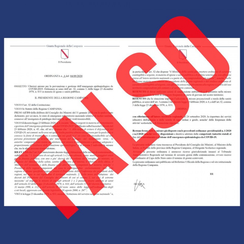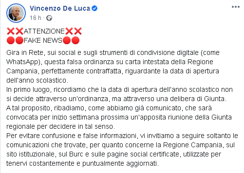 Data apertura scuole, DE LUCA: "In rete falsa ordinanza su carta intestata della Regione"