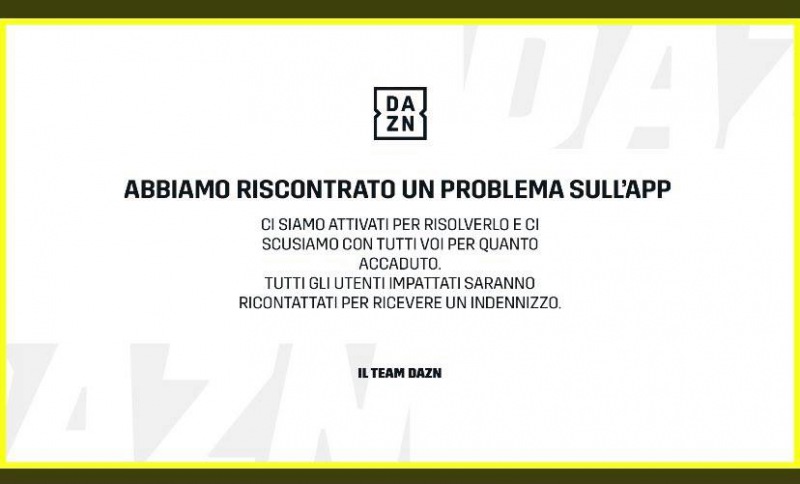 Parecchi tifosi ed appassionati di calcio stanno riscontrando anche oggi problemi a vedere le partite di calcio sulla pay tv Dazn. Questo il messaggio rilasciato sul proprio profilo Twitter.