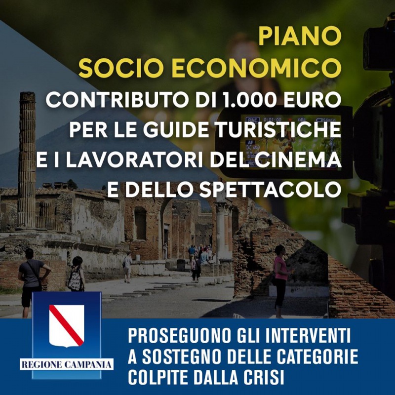 Proseguono gli interventi del Piano socio economico della Regione Campania a sostegno delle categorie particolarmente colpite dalla crisi degli ultimi mesi. Abbiamo approvato un sostegno straordinario una tantum, fino ad un massimo di 1000 euro, in favore dei lavoratori dello spettacolo. Bonus di solidarietà di 1000 euro anche per i lavoratori del comparto cinematografico e audiovisivo. Bonus una tantum fino a 1000 è previsto anche per gli accompagnatori e guide turistiche, alpine e vulcanologiche abilitate residenti in Campania."