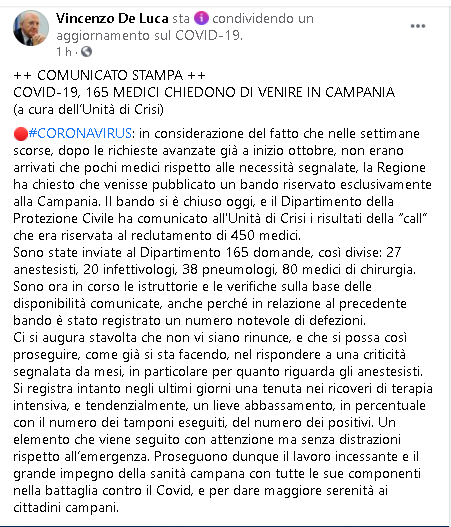 Lo apprendiamo dalla pagina Facebook del Presidente della Regione Campania, Vincenzo De Luca.
