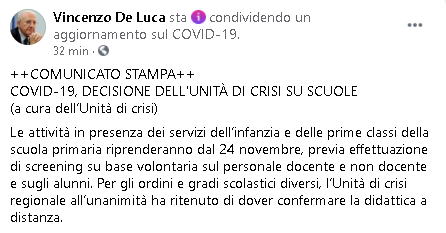 Lo apprendiamo dalla pagina Facebook del Presidente della Regione Campania, Vincenzo De Luca.