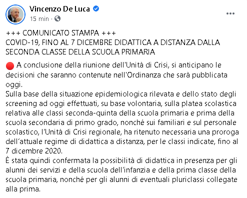 Lo apprendiamo dalla pagina Facebook del Presidente della Regione Campania, Vincenzo De Luca.