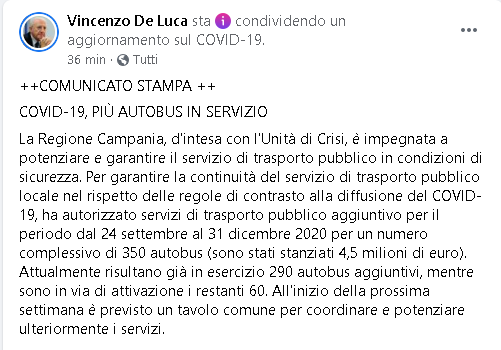 Lo apprendiamo dalla pagina facebook del Presidente della Regione Campania, Vincenzo De Luca.
