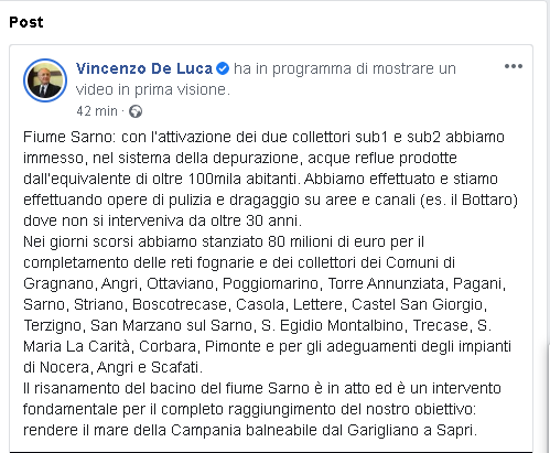"Fiume Sarno: con l’attivazione dei due collettori sub1 e sub2 abbiamo immesso, nel sistema della depurazione, acque reflue prodotte dall’equivalente di oltre 100mila abitanti. Abbiamo effettuato e stiamo effettuando opere di pulizia e dragaggio su aree e canali (es. il Bottaro) dove non si interveniva da oltre 30 anni. Nei giorni scorsi abbiamo stanziato 80 milioni di euro per il completamento delle reti fognarie e dei collettori dei Comuni di Gragnano, Angri, Ottaviano, Poggiomarino, Torre Annunziata, Pagani, Sarno, Striano, Boscotrecase, Casola, Lettere, Castel San Giorgio, Terzigno, San Marzano sul Sarno, S. Egidio Montalbino, Trecase, S. Maria La Carità, Corbara, Pimonte e per gli adeguamenti degli impianti di Nocera, Angri e Scafati. Il risanamento del bacino del fiume Sarno è in atto ed è un intervento fondamentale per il completo raggiungimento del nostro obiettivo: rendere il mare della Campania balneabile dal Garigliano a Sapri."