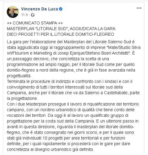 Lo apprendiamo dalla pagina Facebook del Presidente della Rgione Campania, Vincenzo De Luca.