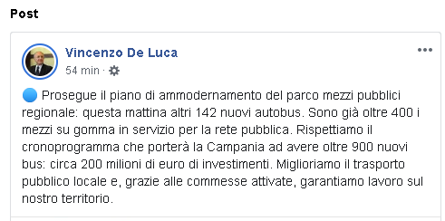 "Prosegue il piano di ammodernamento del parco mezzi pubblici regionale: questa mattina altri 142 nuovi autobus. Sono già oltre 400 i mezzi su gomma in servizio per la rete pubblica. Rispettiamo il cronoprogramma che porterà la Campania ad avere oltre 900 nuovi bus: circa 200 milioni di euro di investimenti. Miglioriamo il trasporto pubblico locale e, grazie alle commesse attivate, garantiamo lavoro sul nostro territorio."