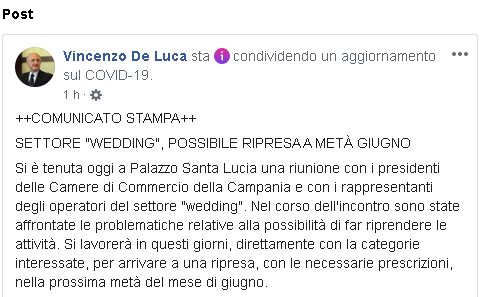 Si è tenuta oggi a Palazzo Santa Lucia una riunione con i presidenti delle Camere di Commercio della Campania e con i rappresentanti degli operatori del settore "wedding". Nel corso dell'incontro sono state affrontate le problematiche relative alla possibilità di far riprendere le attività. Si lavorerà in questi giorni, direttamente con la categorie interessate, per arrivare a una ripresa, con le necessarie prescrizioni, nella prossima metà del mese di giugno."