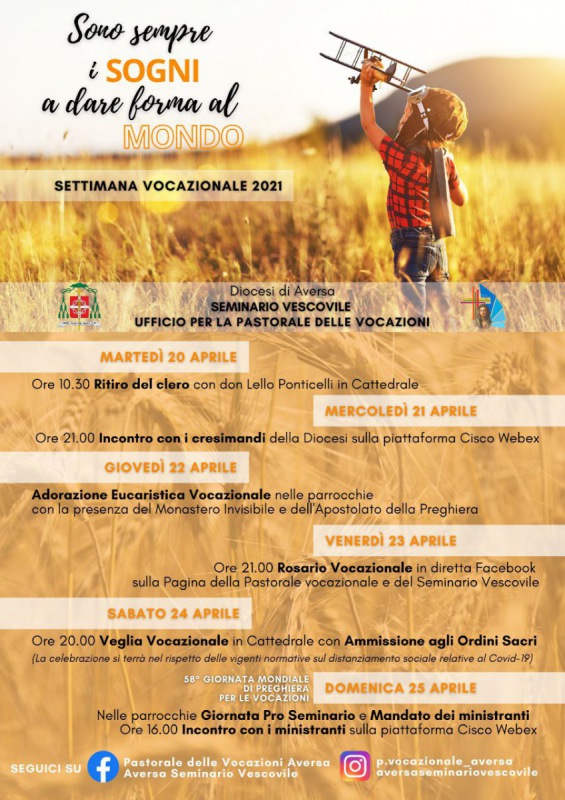Pubblichiamo nota stampa Diocesi di Aversa: "Aversa, 18-25 aprile 2021: un’intensa Settimana Vocazionale tra presenza e streaming Don Stefano Rega: “Previste tante iniziative, vogliamo stimolare la riflessione e la preghiera per la vocazione: la nostra vita è un bene ricevuto, facciamone un dono per gli altri”