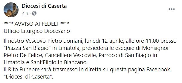 Questo quanto pubblicato sulla pagina fb della Diocesi di Caserta: "AVVISO AI FEDELI Ufficio Liturgico Diocesano Il nostro Vescovo Pietro domani, lunedì 12 aprile, alle ore 11:00 presso "Piazza San Biagio" in Limatola, presiederà le esequie di Monsignor Pietro De Felice - si legge nella nota -, Cancelliere Vescovile, Parroco di San Biagio in Limatola e Sant'Eligio in Biancano. Il Rito Funebre sarà trasmesso in diretta su questa pagina Facebook "Diocesi di Caserta"."