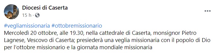 Questo quanto apprendiamo dalla pagina fb della Diocesi di Caserta: "Mercoledì 20 ottobre, alle 19.30, nella cattedrale di Caserta, monsignor Pietro Lagnese, Vescovo di Caserta; presiederà una veglia missionaria con il popolo di Dio per l’ottobre missionario e la giornata mondiale missionaria"