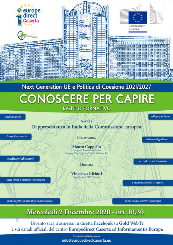 Mercoledì 2 dicembre alle ore 10:30 in diretta sulla nostra pagina facebook Gold WebTv e sui canali ufficiali di Europedirect Caserta e Informamentis Europa vi sarà un'intervista per capire la Next Generation UE e Politica di Coesione 2021/2027. Oltre ai saluti della Rappresentanza in Italia della Commissione europea vi sarà il coordinatore EDIC Caserta Vincenzo Girfatti che intervisterà Mauro Cappello, esperto di fondi comunitari nonché docente all'università Roma Tre.