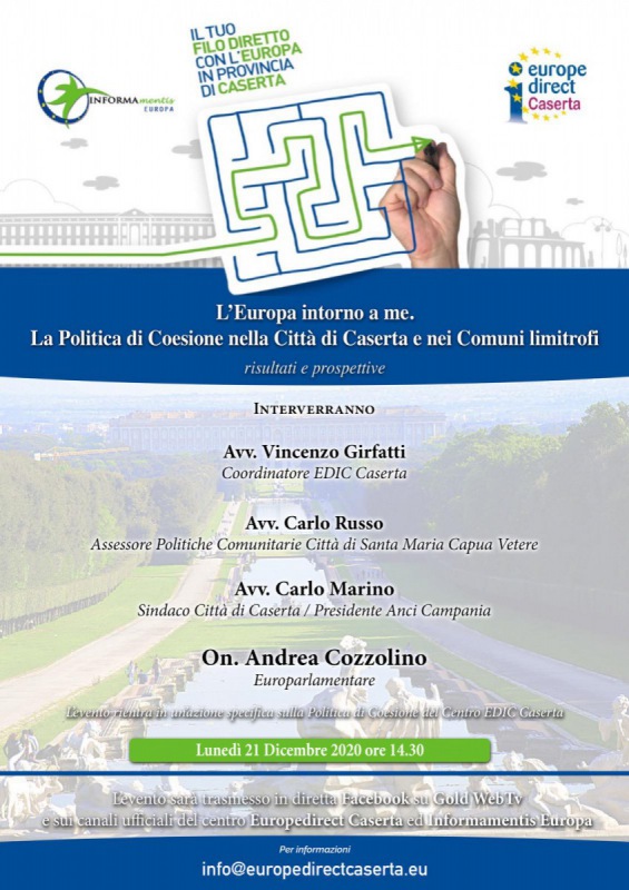 Lunedì 21 dicembre alle ore 14:30 si terrà l'appuntamento in diretta streaming sulla pagina Facebook di Gold WebTv dal titolo: "L'Europa intorno a me. La Politica di Coesione nella Città di Caserta e nei Comuni limitrofi". Evento organizzato da Europedirect Caserta e Informamentis Europa. Interverranno l'avv. Vincenzo Girfatti, coordinatore EDIC Caserta, l'avv. Carlo Russo, Ass. di SMCV, avv. Carlo Marino, Sindaco di Caserta, e l'on. Andrea Cozzolino, europarlamentare.