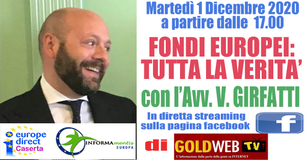 Alle ore 17 di oggi, martedì 1 dicembre, vi sarà la diretta streaming sulla pagina facebook di Gold WebTv dell'evento che riguarda i fondi europei con l'avvocato Vincenzo Girfatti.