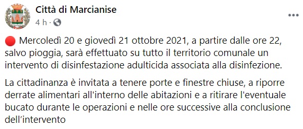 Questo quanto apprendiamo dalla pagina fb del Comune di Marcianise: "Mercoledì 20 e giovedì 21 ottobre 2021, a partire dalle ore 22, salvo pioggia, sarà effettuato su tutto il territorio comunale un intervento di disinfestazione adulticida associata alla disinfezione. La cittadinanza è invitata a tenere porte e finestre chiuse, a riporre derrate alimentari all'interno delle abitazioni e a ritirare l'eventuale bucato durante le operazioni e nelle ore successive alla conclusione dell’intervento"