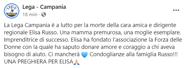"La Lega Campania è a lutto per la morte della cara amica e dirigente regionale Elisa Russo. Una mamma premurosa, una moglie esemplare. Imprenditrice di successo. Elisa ha fondato l'associazione la Forza delle Donne con la quale- si legge nella nota- ha saputo donare amore e coraggio a chi aveva bisogno di aiuto. Ci mancherà. Condoglianze alla famiglia Russo!!! UNA PREGHIERA PER ELISA"