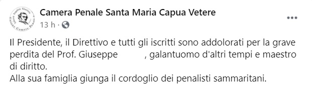 "Il Presidente, il Direttivo e tutti gli iscritti sono addolorati per la grave perdita del Prof. Giuseppe ... ,-si legge nella nota- galantuomo d'altri tempi e maestro di diritto. Alla sua famiglia giunga il cordoglio dei penalisti sammaritani."