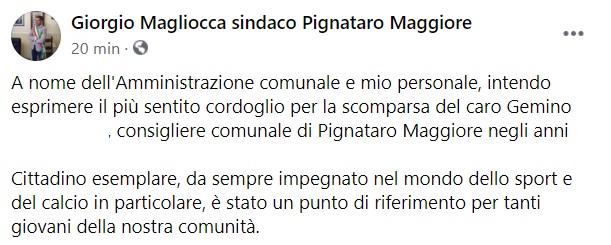 "A nome dell'Amministrazione comunale e mio personale, intendo esprimere il più sentito cordoglio per la scomparsa del caro Gemino... consigliere comunale di Pignataro Maggiore... Cittadino esemplare, da sempre impegnato- si legge nella nota- nel mondo dello sport e del calcio in particolare, è stato un punto di riferimento per tanti giovani della nostra comunità."