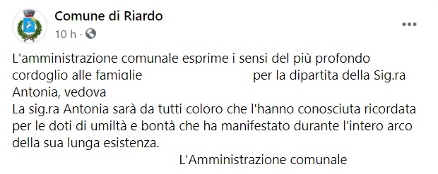 "L'amministrazione comunale esprime i sensi del più profondo cordoglio alle famiglie ... per la dipartita della Sig.ra Antonia, vedova ... -Si legge nella nota- La sig.ra Antonia sarà da tutti coloro che l'hanno conosciuta ricordata per le doti di umiltà e bontà che ha manifestato durante l'intero arco della sua lunga esistenza. L'Amministrazione comunale"