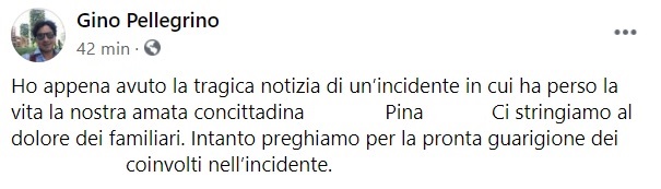 Questo il messaggio di cordoglio che apprendiamo dalla pagina facebook di Gino Pellegrino Sindaco di Parete: "Ho appena avuto la tragica notizia di un’incidente in cui ha perso la vita la nostra amata concittadina ... Pina ... Ci stringiamo al dolore dei familiari. Intanto preghiamo per la pronta guarigione dei ... coinvolti nell’incidente."