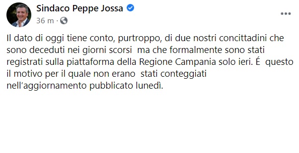 "Il dato di oggi tiene conto, purtroppo, di due nostri concittadini che- si legge nella nota- sono deceduti nei giorni scorsi ma che formalmente sono stati registrati sulla piattaforma della Regione Campania solo ieri. É questo il motivo per il quale non erano stati conteggiati nell’aggiornamento pubblicato lunedì..."