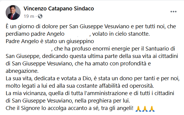 Questo il post pubblicato da Vincenzo Catapano, sindaco di San Giuseppe Vesuviano, sulla sua pagina Facebook: "È un giorno di dolore per San Giuseppe Vesuviano e per tutti noi, che perdiamo padre Angelo (...), volato in cielo stanotte. Padre Angelo - si legge - è stato un giuseppino (...), che ha profuso enormi energie per il Santuario di San Giuseppe, dedicando questa ultima parte della sua vita ai cittadini di San Giuseppe Vesuviano, che ha amato con profondità e abnegazione. La sua vita, dedicata e votata a Dio, è stata - recita il post - un dono per tanti e per noi, molto legati a lui ed alla sua costante affabilità ed operosità. La mia vicinanza, quella di tutta l'amministrazione e di tutti i cittadini di San Giuseppe Vesuviano, nella preghiera per lui. Che il Signore lo accolga accanto a sé, tra gli angeli"!