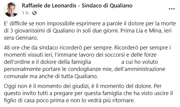 "E' difficile se non impossibile esprimere a parole il dolore per la morte di 3 giovanissimi di Qualiano in soli due giorni. Prima Lia e Mina, ieri sera Gennaro. 48 ore che da sindaco ricorderò per sempre. Ricorderò per sempre i momenti vissuti ieri, l'immane lavoro- si legge nella nota- dei soccorsi e delle forze dell'ordine e il dolore della famiglia ... a cui ho voluto personalmente portare le condoglianze mie, dell'amministrazione comunale ma anche di tutta Qualiano. Oggi non è il momento dei giudizi, è il momento del dolore. Per questo invito tutti- si legge nella nota- a pregare per questa famiglia che ha visto uscire il figlio di casa poco prima e non lo vedrà più ritornare."