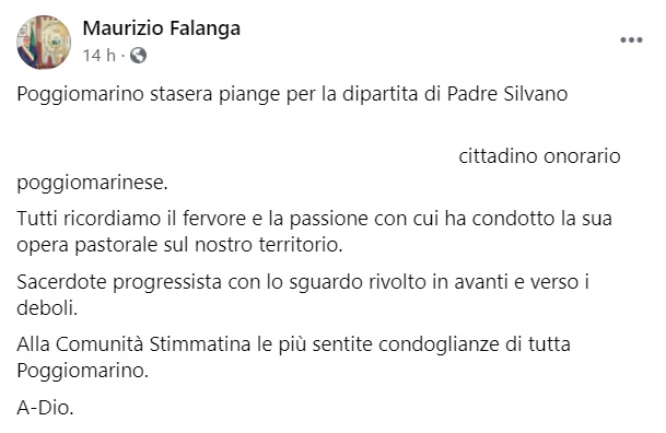 "Poggiomarino stasera piange per la dipartita di Padre Silvano ... cittadino onorario poggiomarinese. Tutti ricordiamo il fervore e la passione con cui ha condotto la sua opera pastorale sul nostro territorio. Sacerdote progressista- si legge nella nota- con lo sguardo rivolto in avanti e verso i deboli. Alla Comunità Stimmatina le più sentite condoglianze di tutta Poggiomarino. A-Dio."
